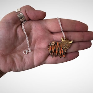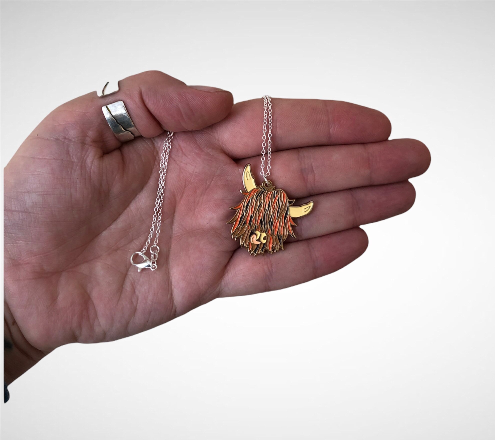 This super cute original design is of a gorgeous highland cow necklace, made in rich orange and brown tones !