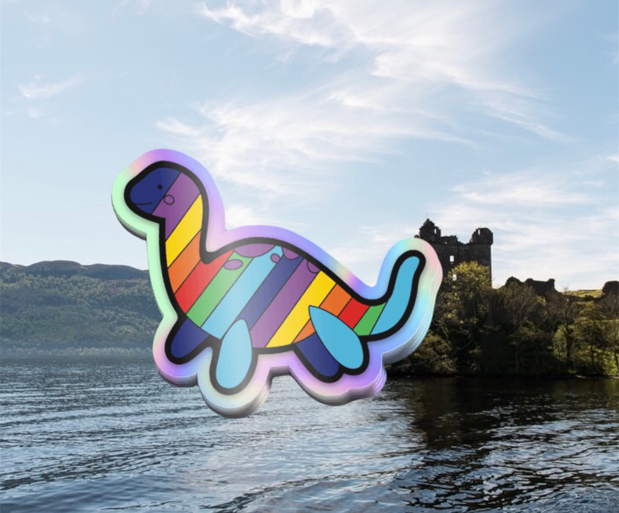 Original design holographic rainbow Loch Ness monster die cut vinyl stickers.
