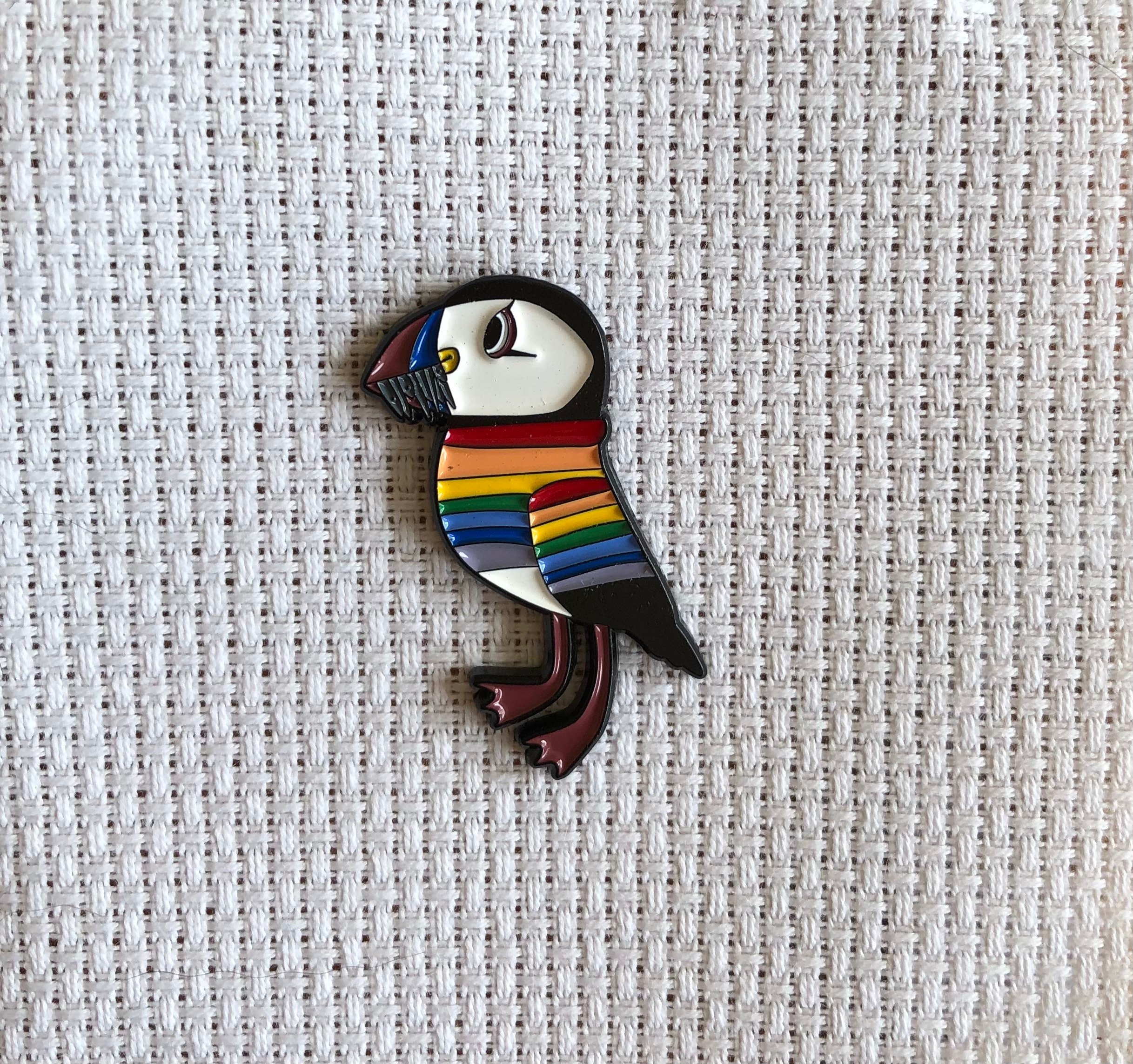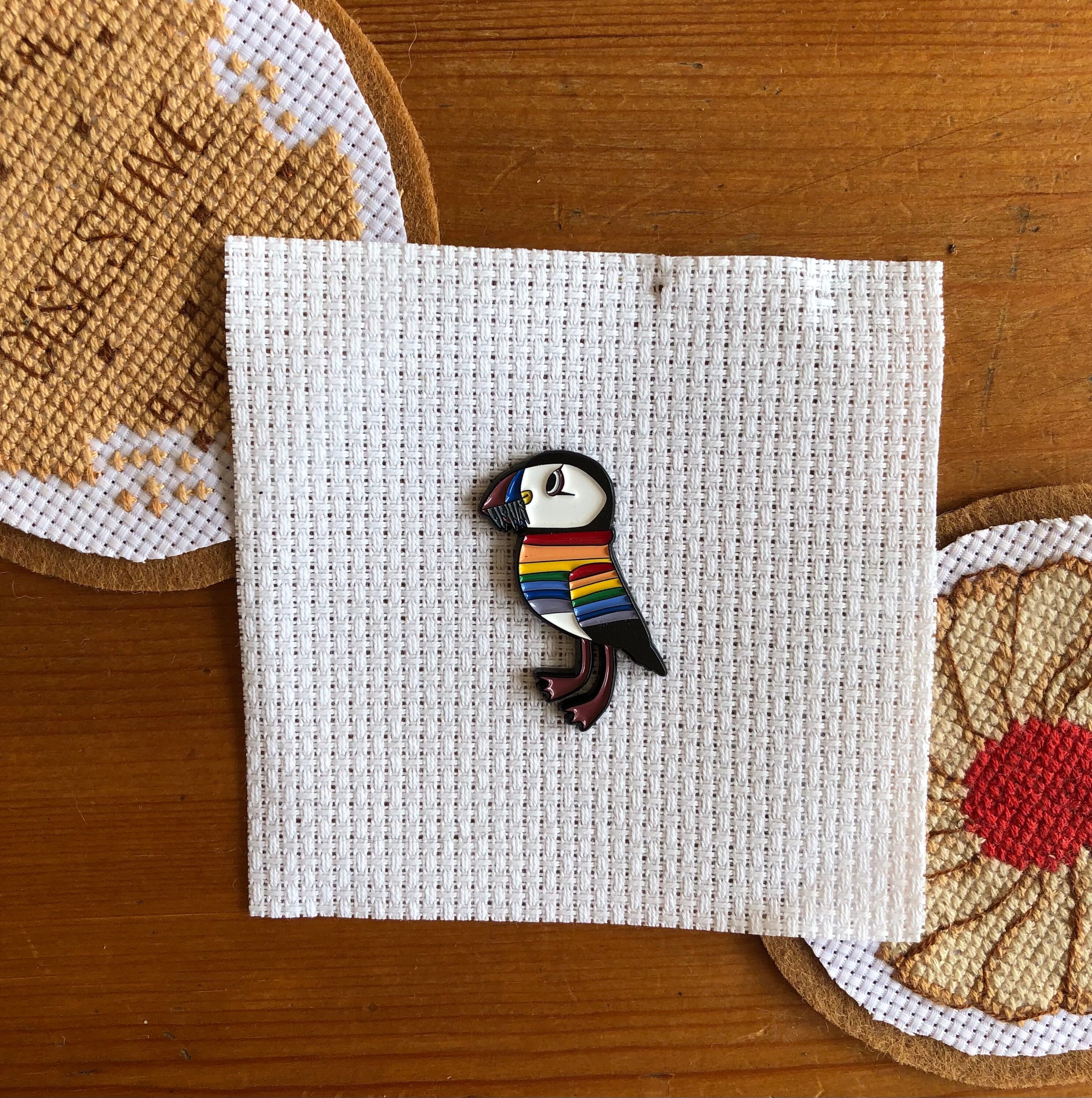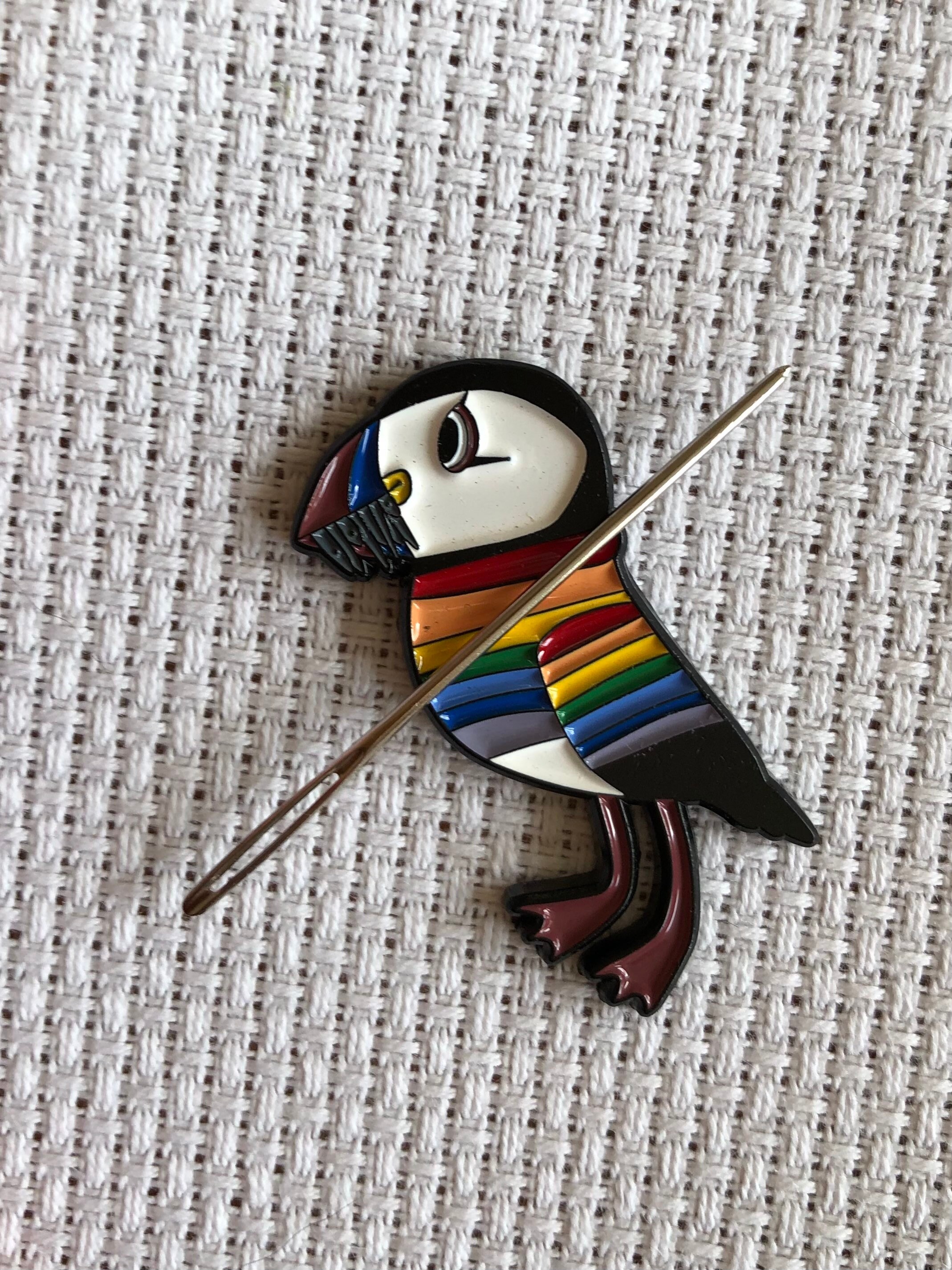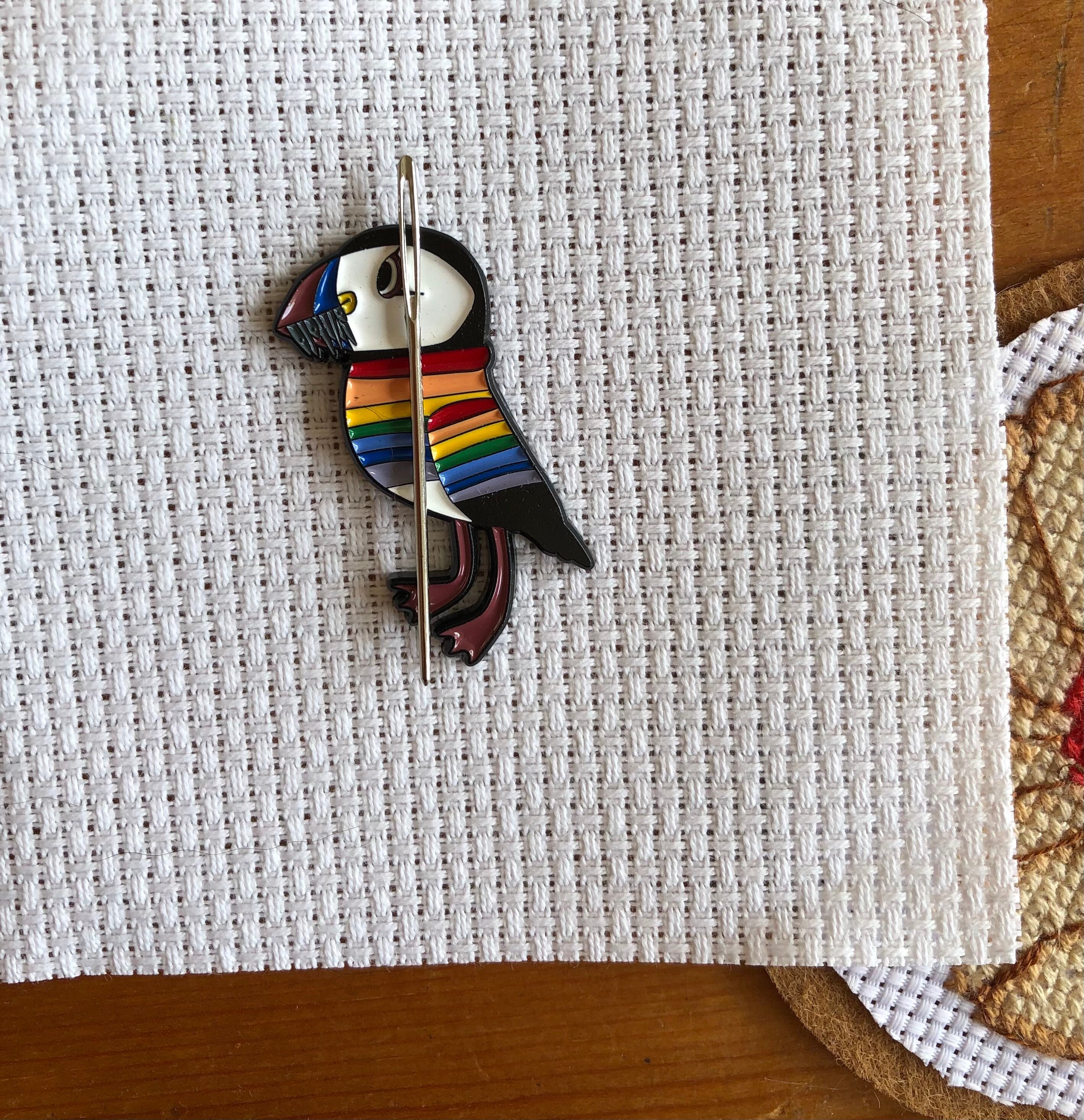 This super cute needle nanny is an original design and would make a perfect gift. The puffin is wearing a rainbow jumper. It is magnetic to keep your needle in place and has a magnet you place underneath the material.