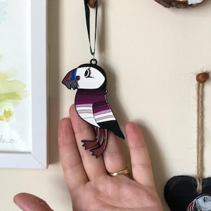 The puffin is wearing a cute little jumper in mustard yellow tones.