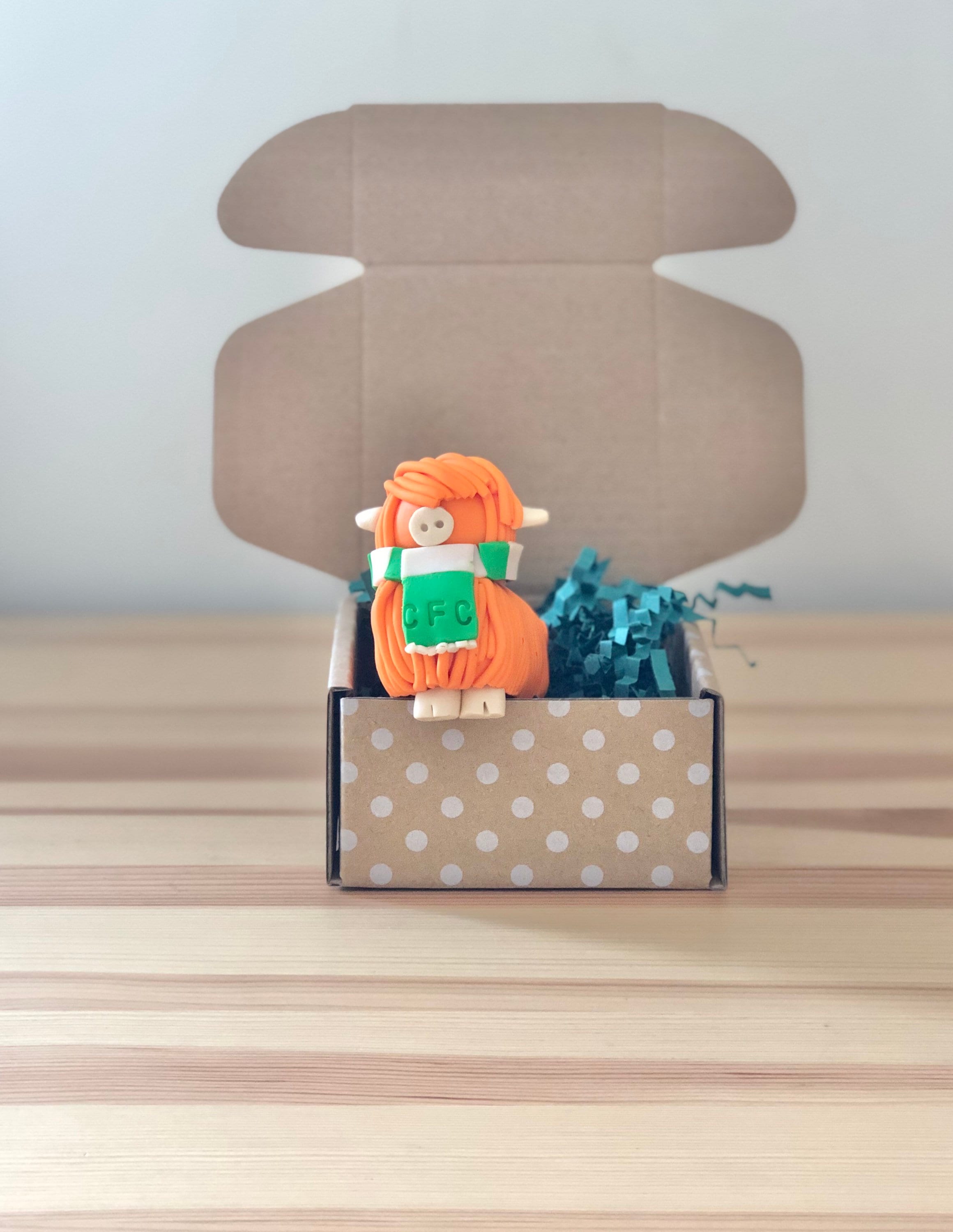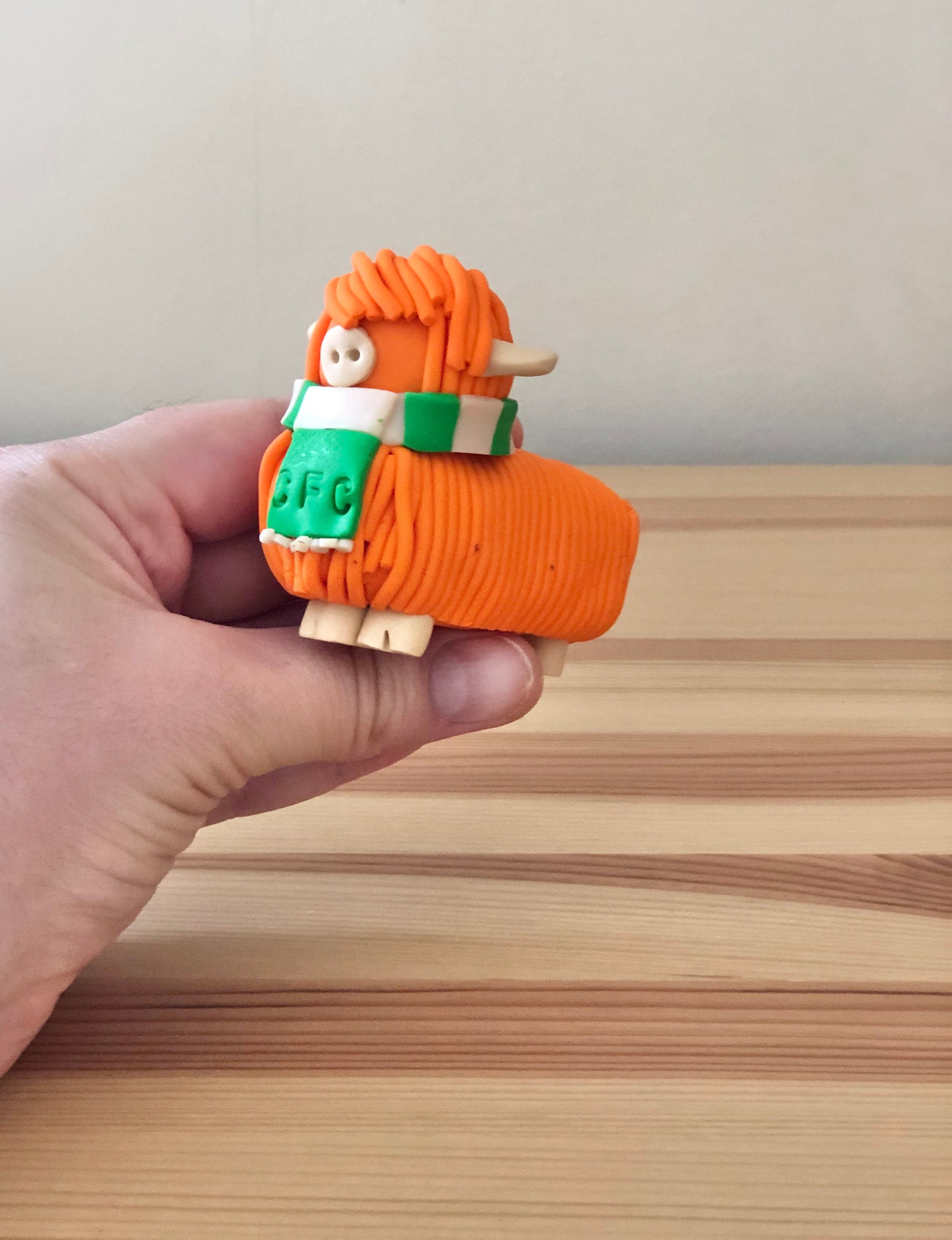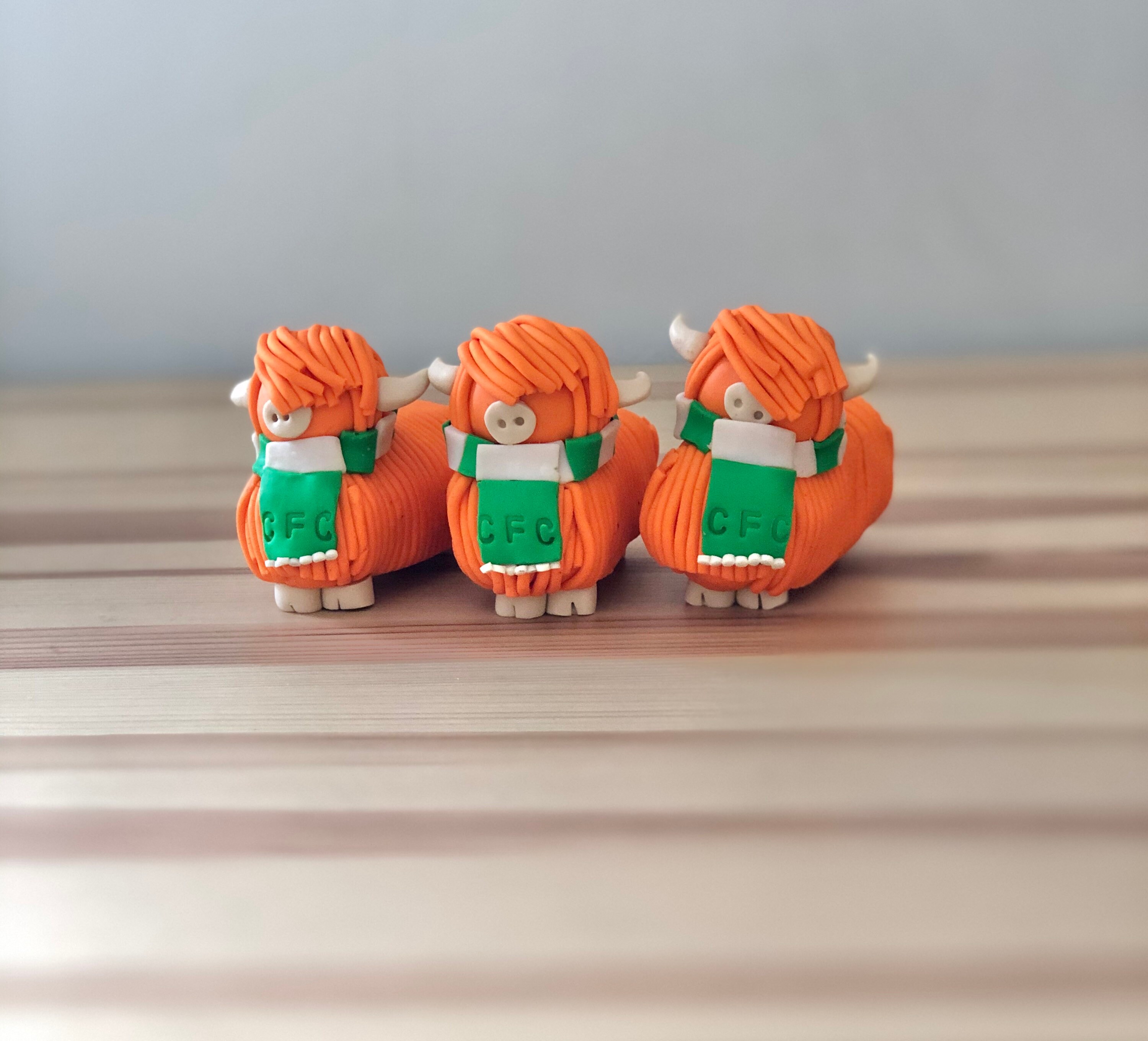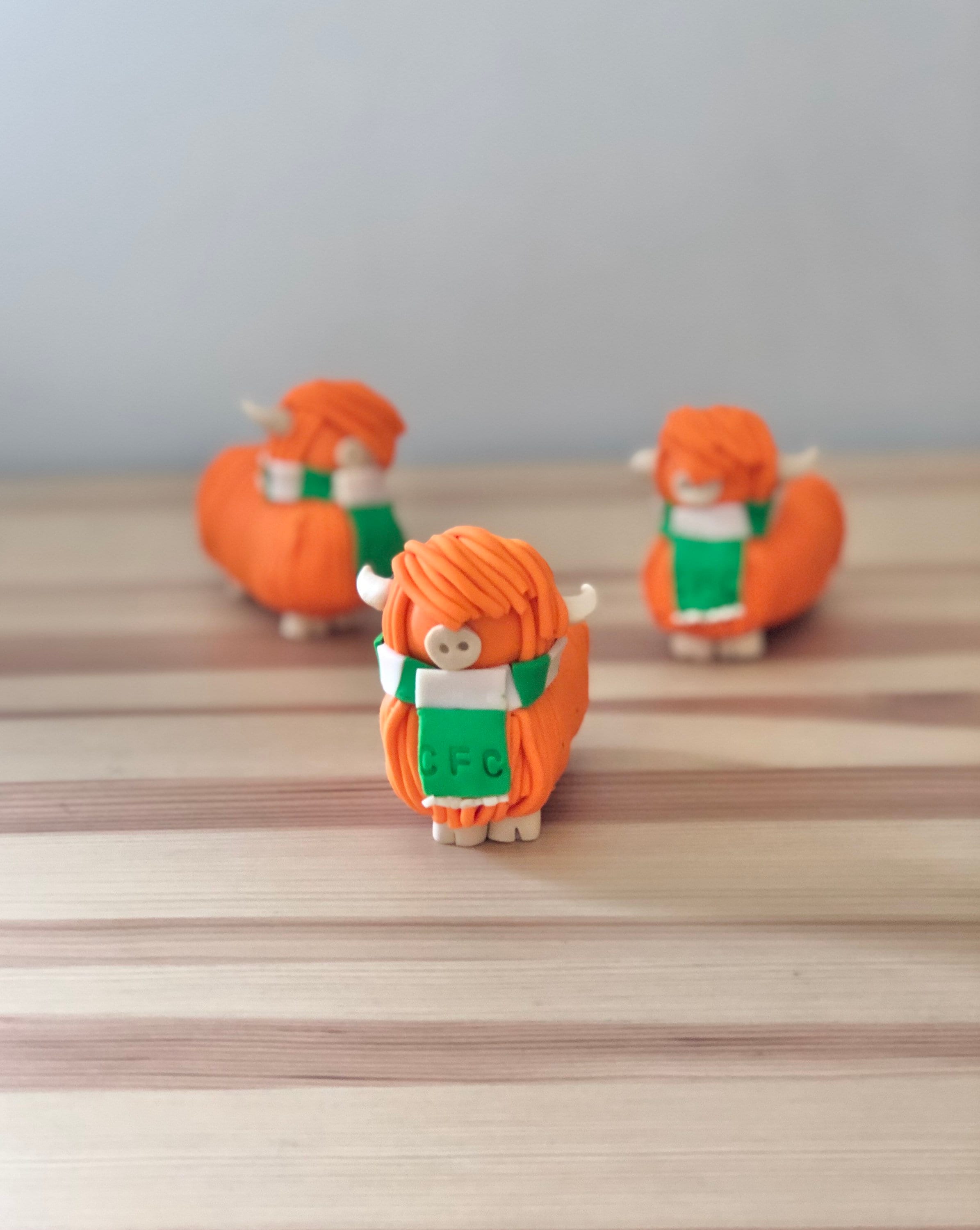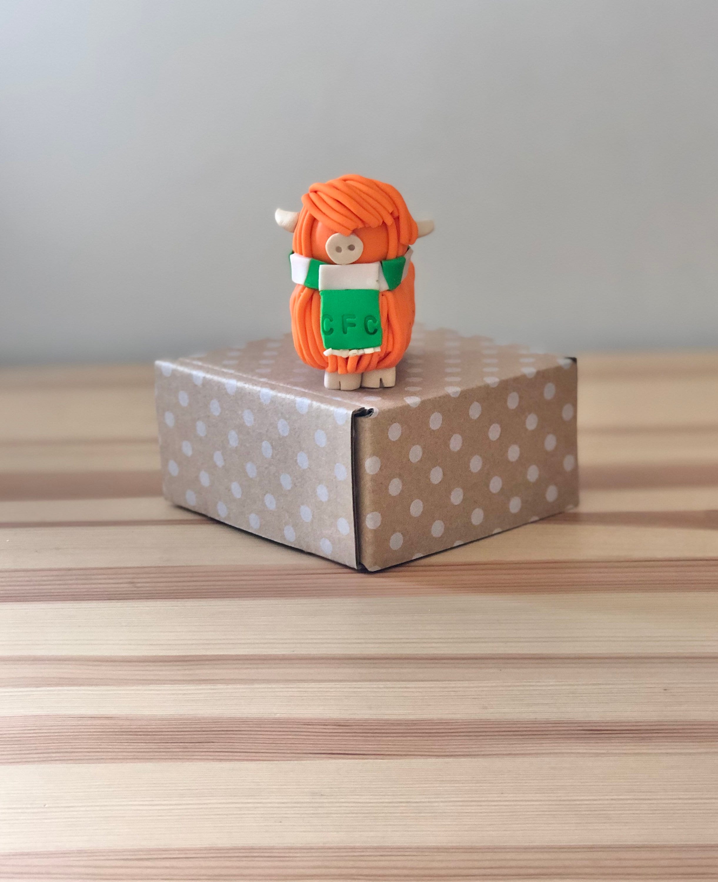 These highland cow models are designed and handmade by me so each one is unique. The highland cow models are finished off with a polymer clay Celtic FC scarf.
