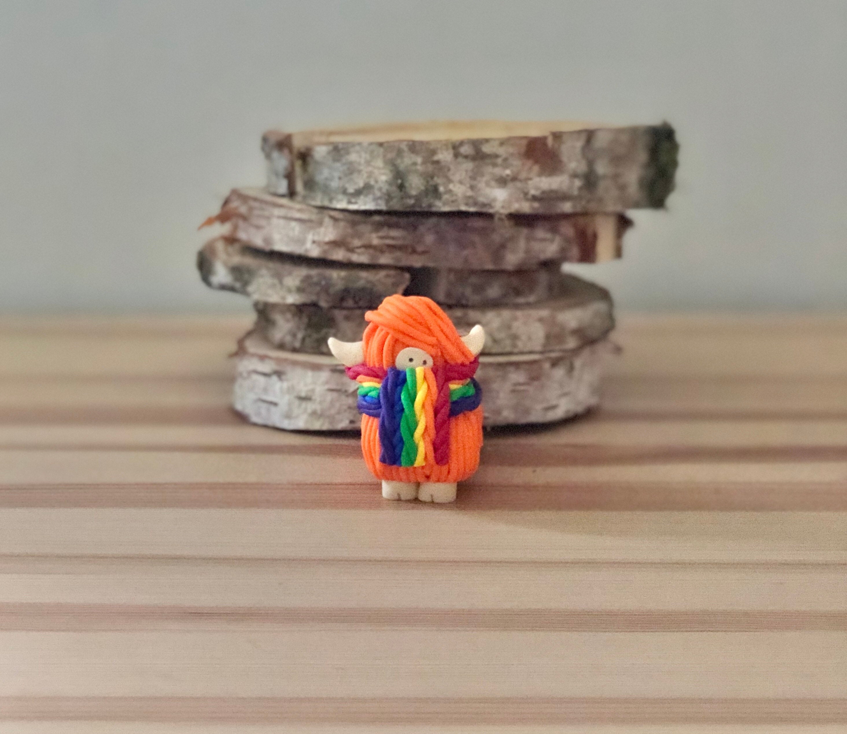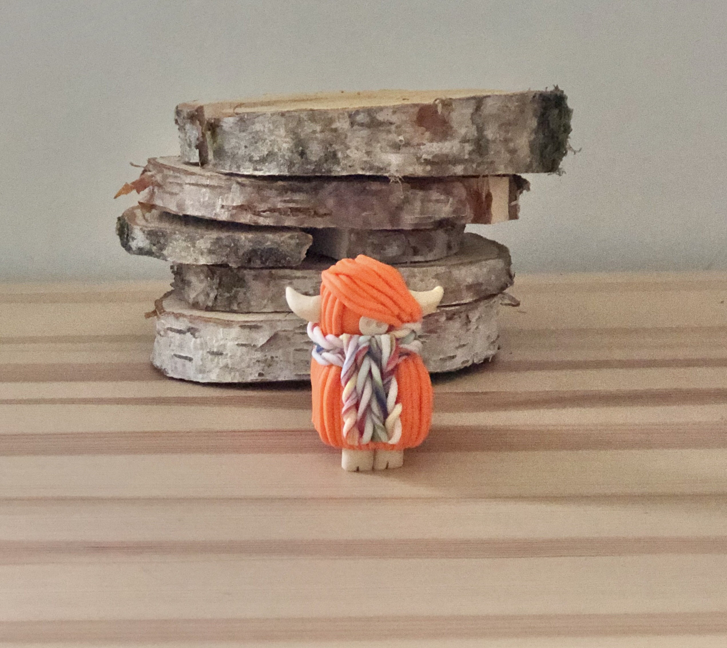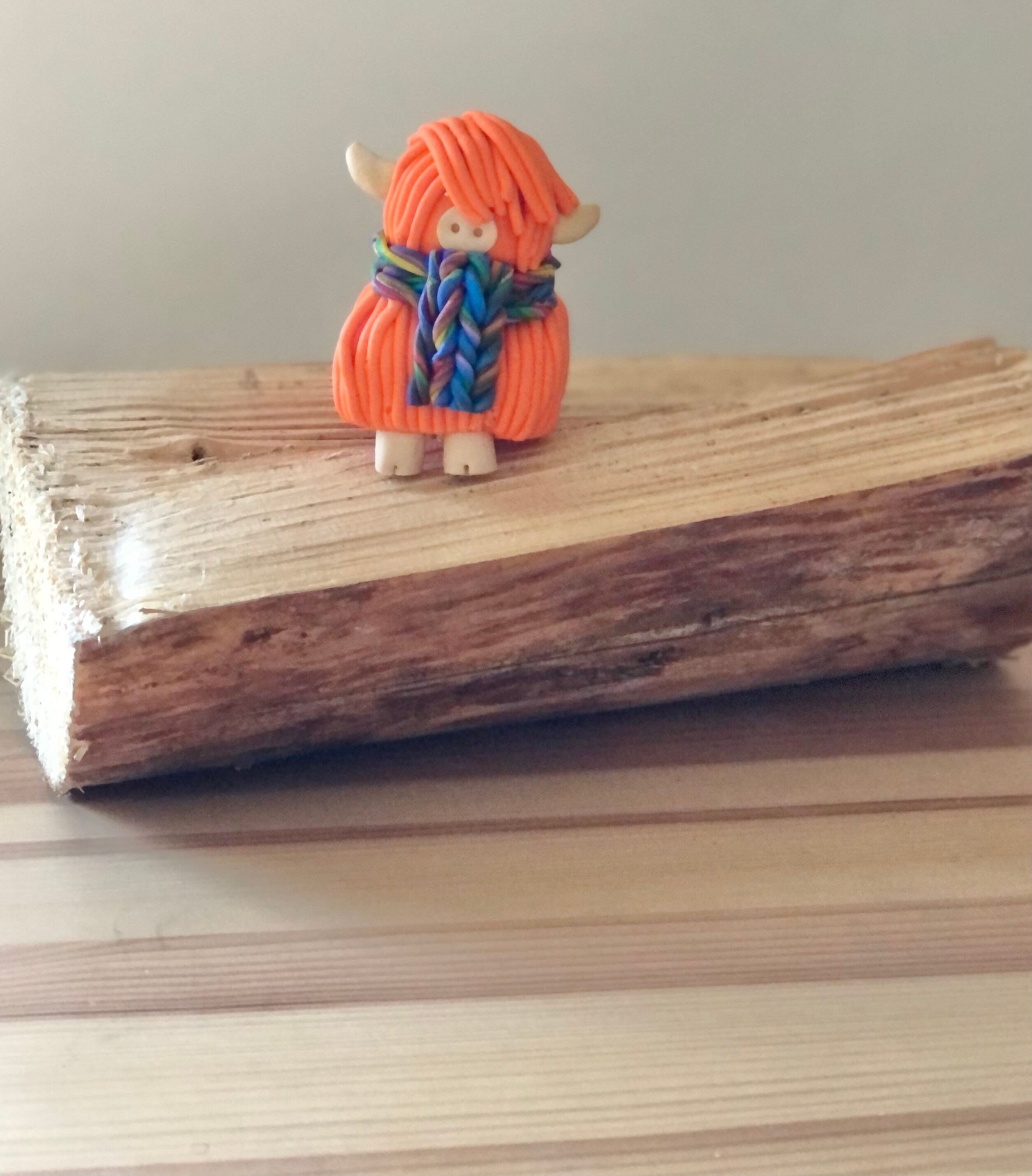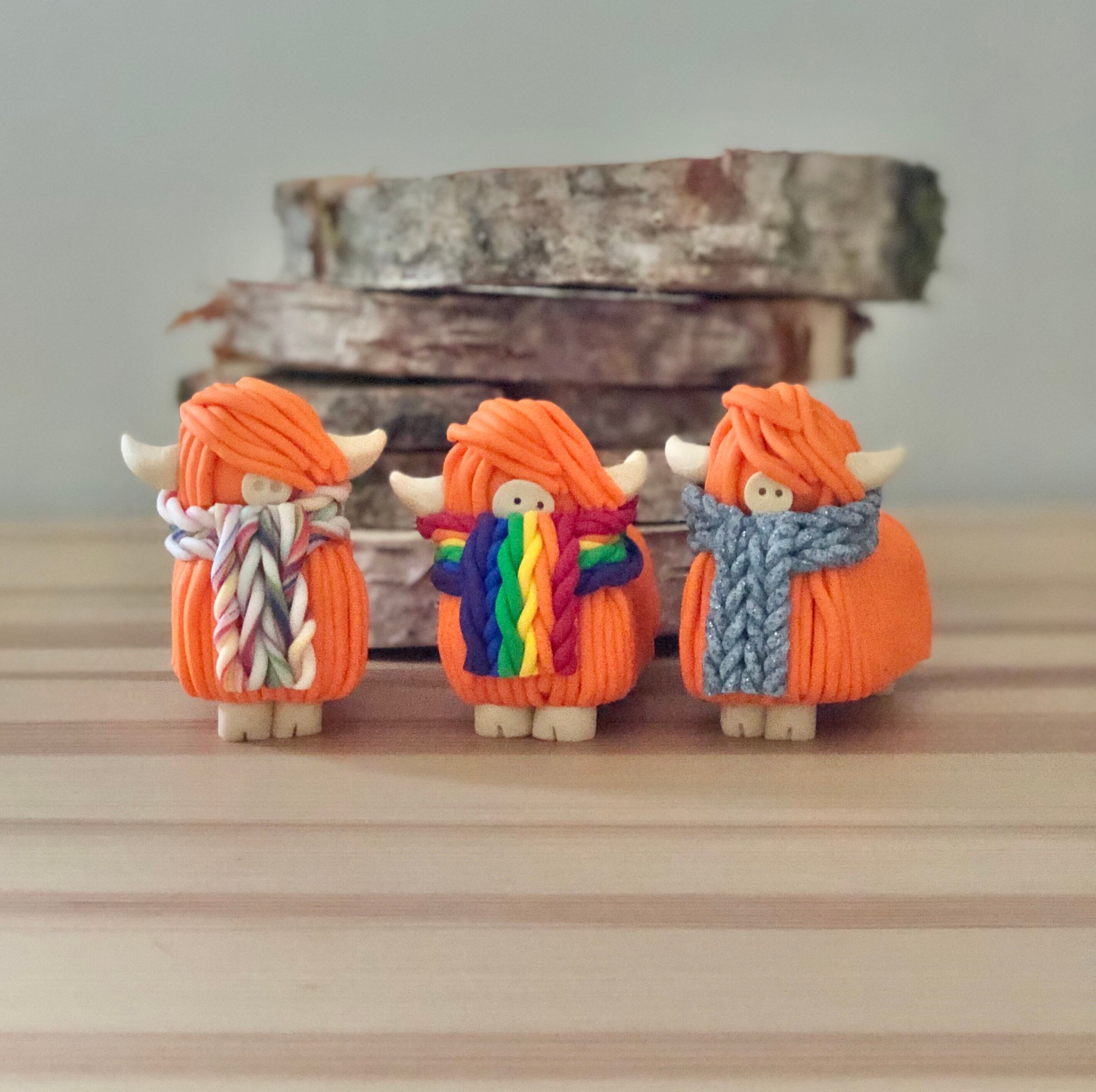 Highland cow models each one is individually designed and unique and inspired from the Scottish wildlife from my highland based art room. The Highland Cow models are designed and handmade by me so each one is unique. I also make the designs in small batches so that each item can make a special gift for someone. Polymer clay is the base material, I combine many different colours to create an original and funky highland cow!