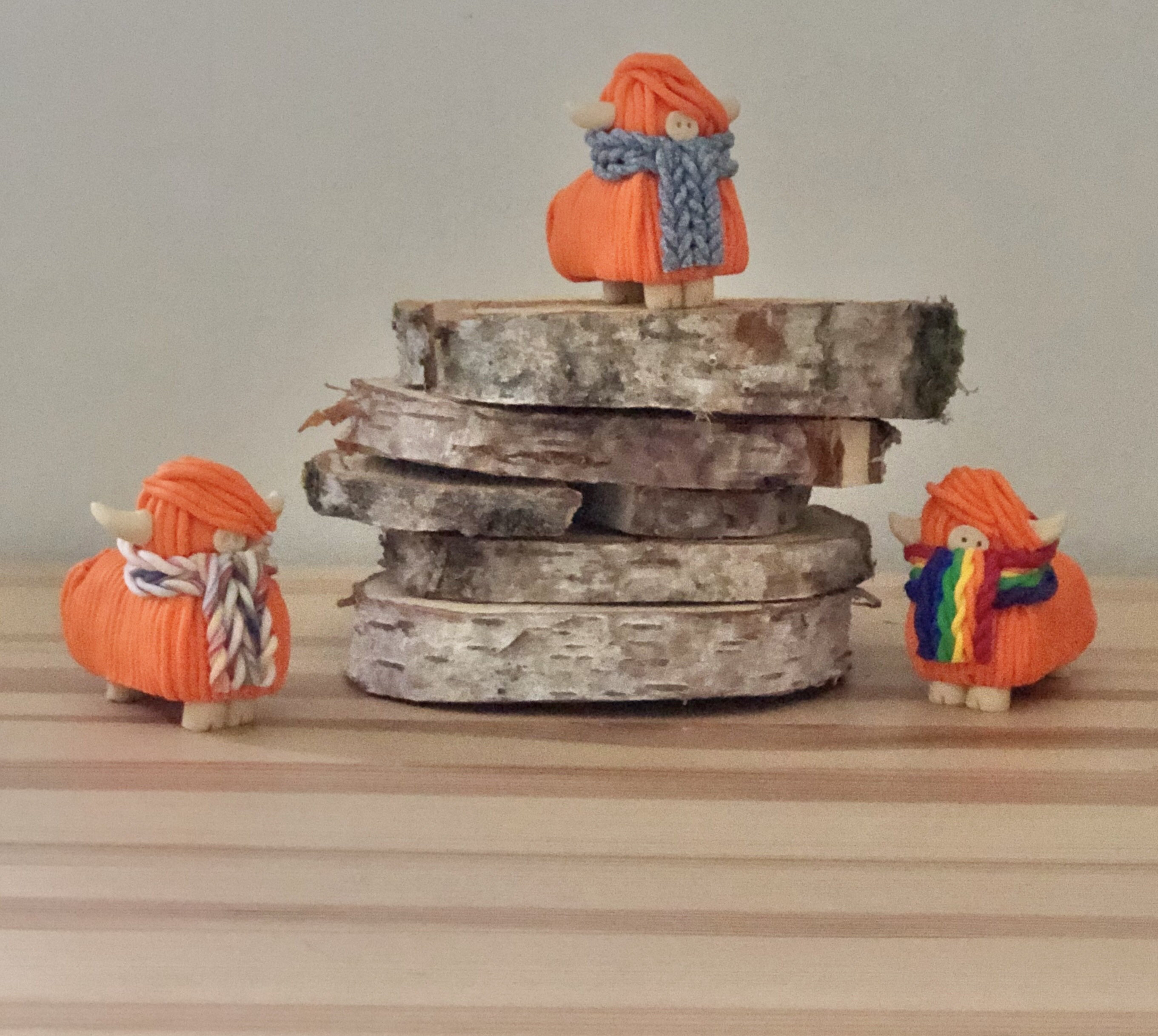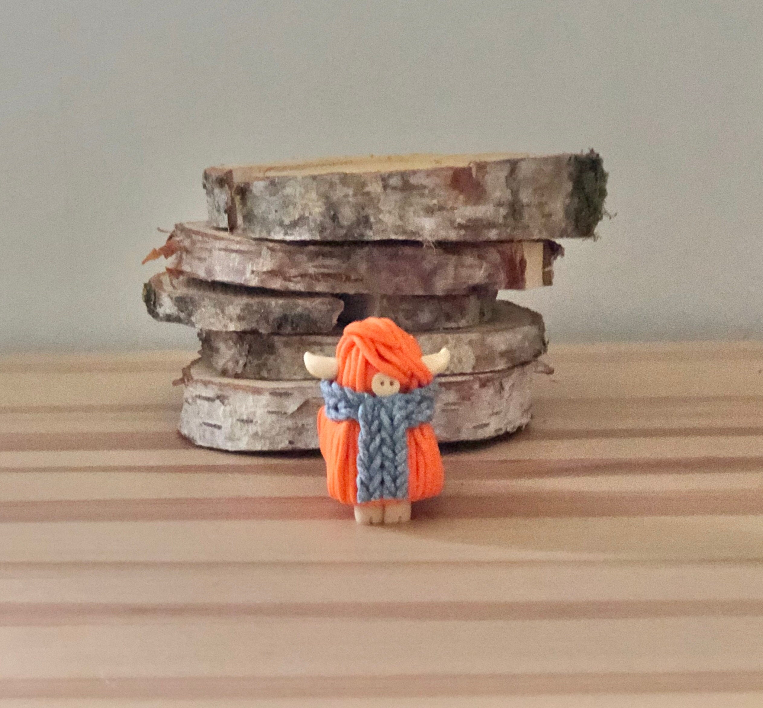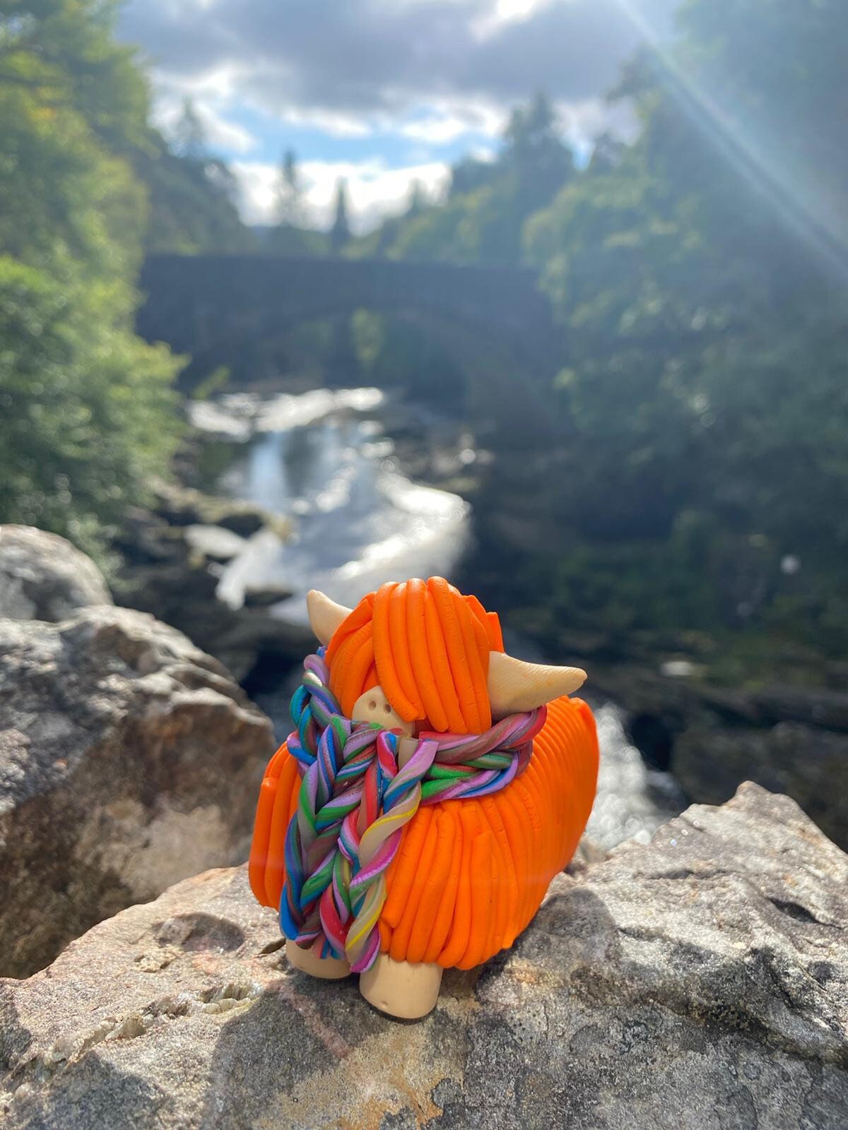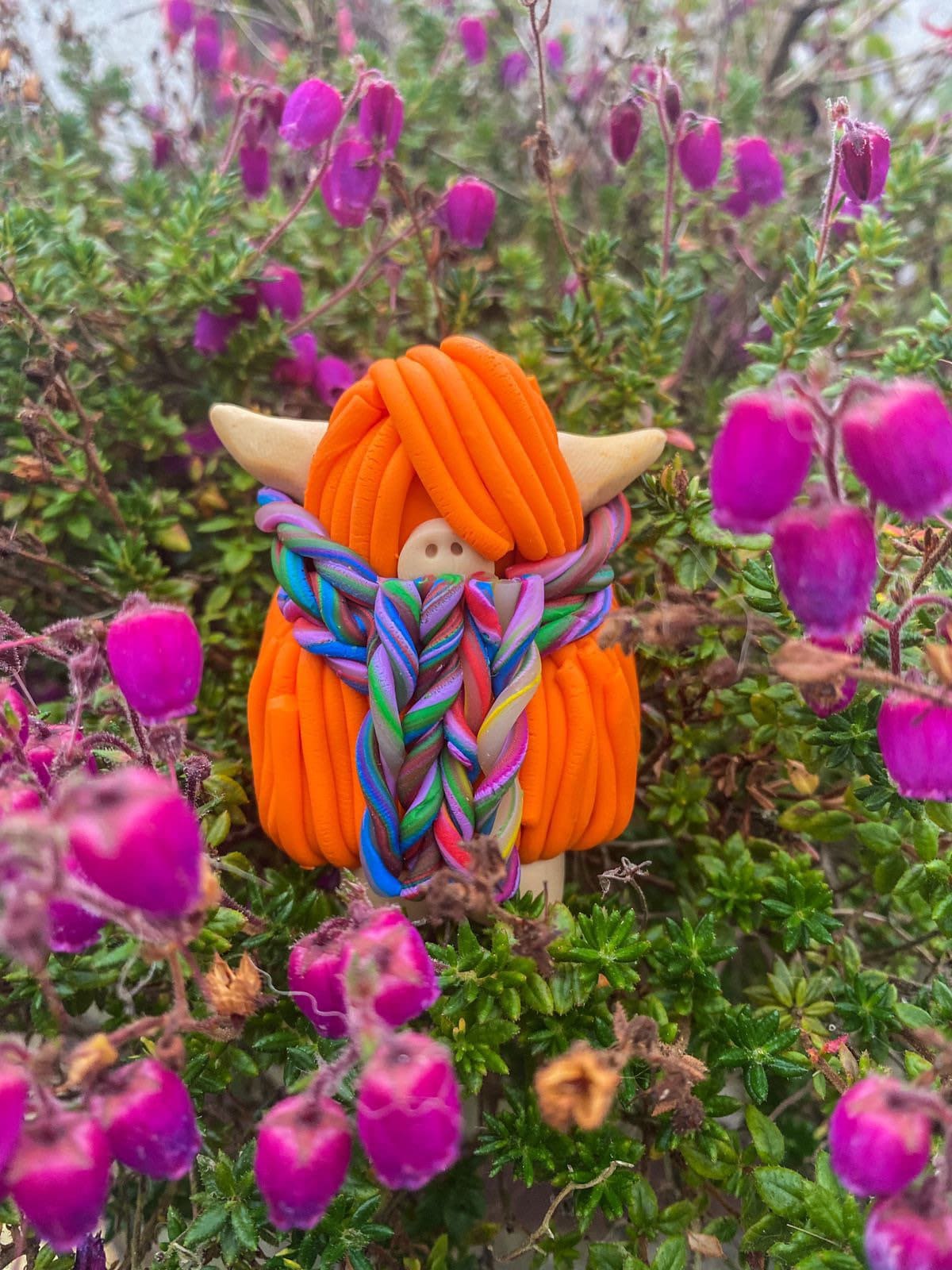 Highland cow models each one is individually designed and unique and inspired from the Scottish wildlife from my highland based art room. The Highland Cow models are designed and handmade by me so each one is unique. I also make the designs in small batches so that each item can make a special gift for someone. Polymer clay is the base material, I combine many different colours to create an original and funky highland cow!