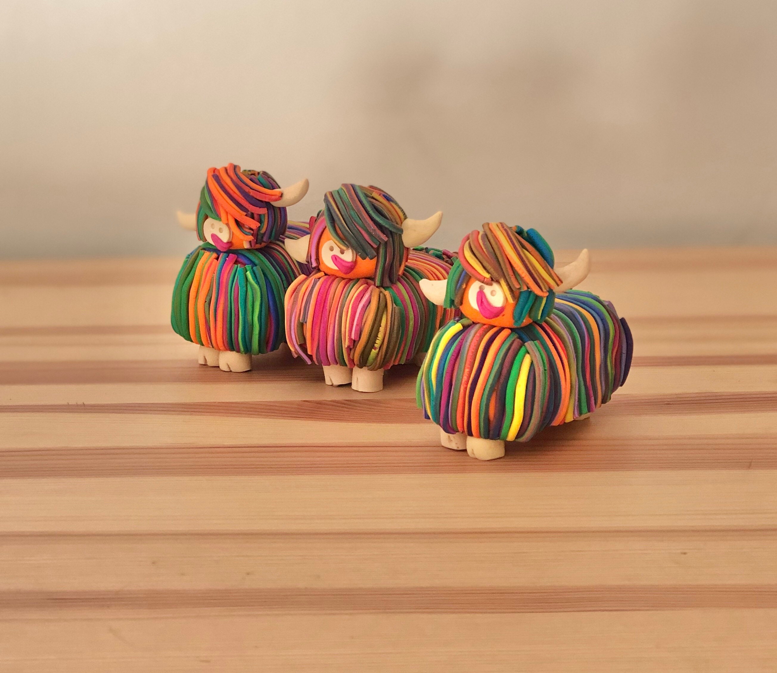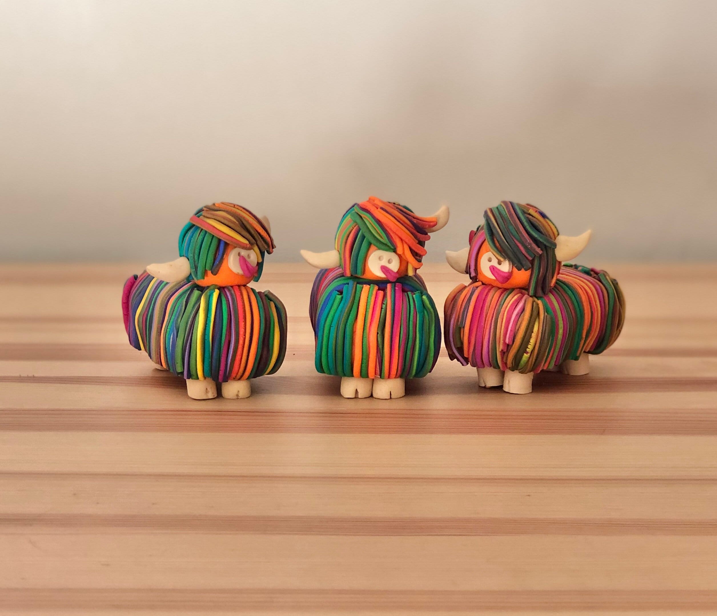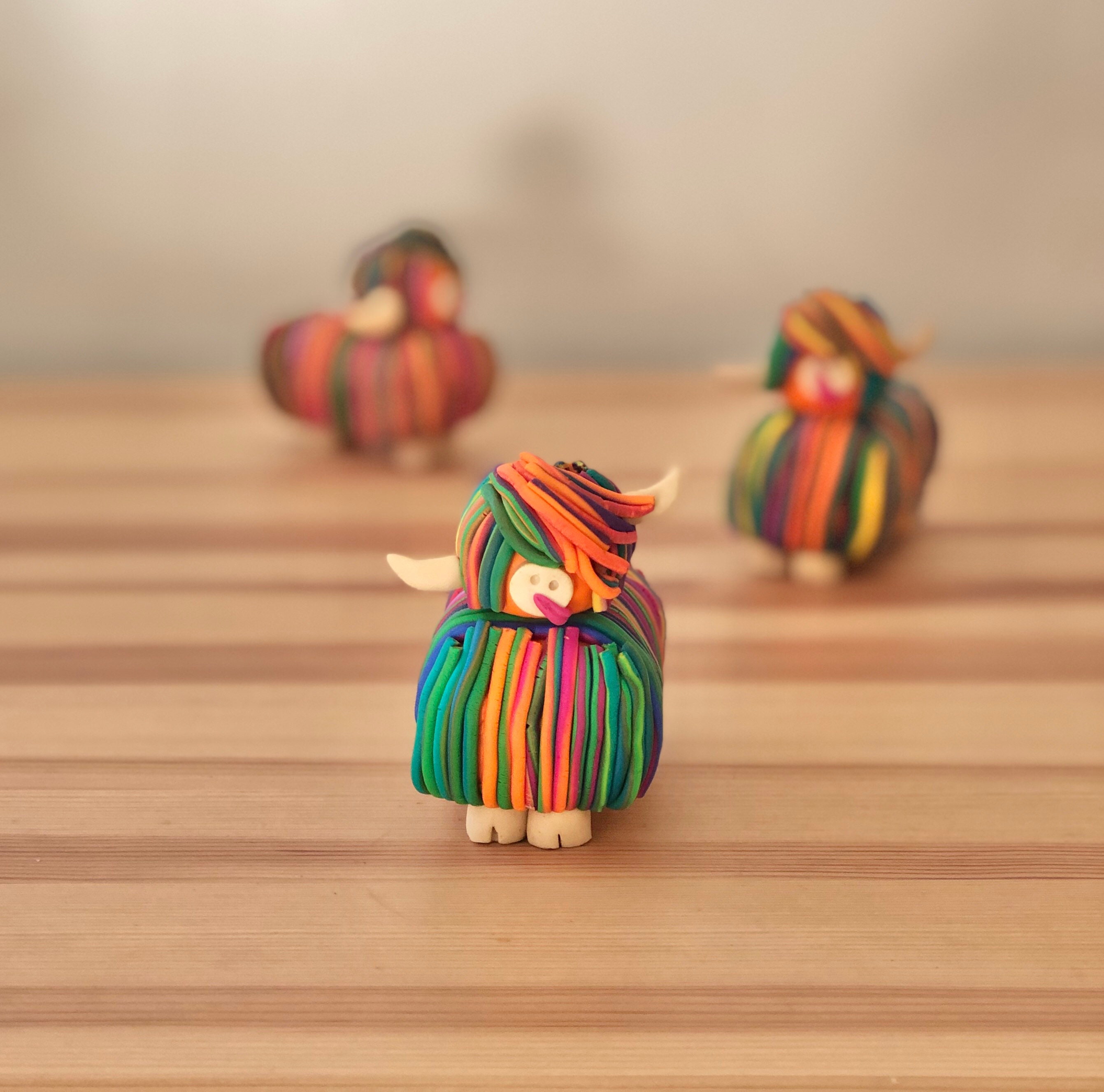 Highland cow models each one is individually designed and unique and inspired from the Scottish wildlife from my highland based art room. The Highland Cow models are designed and handmade by me so each one is unique. I also make the designs in small batches so that each item can make a special gift for someone. Polymer clay is the base material, I combine many different colours to create an original and funky highland cow!