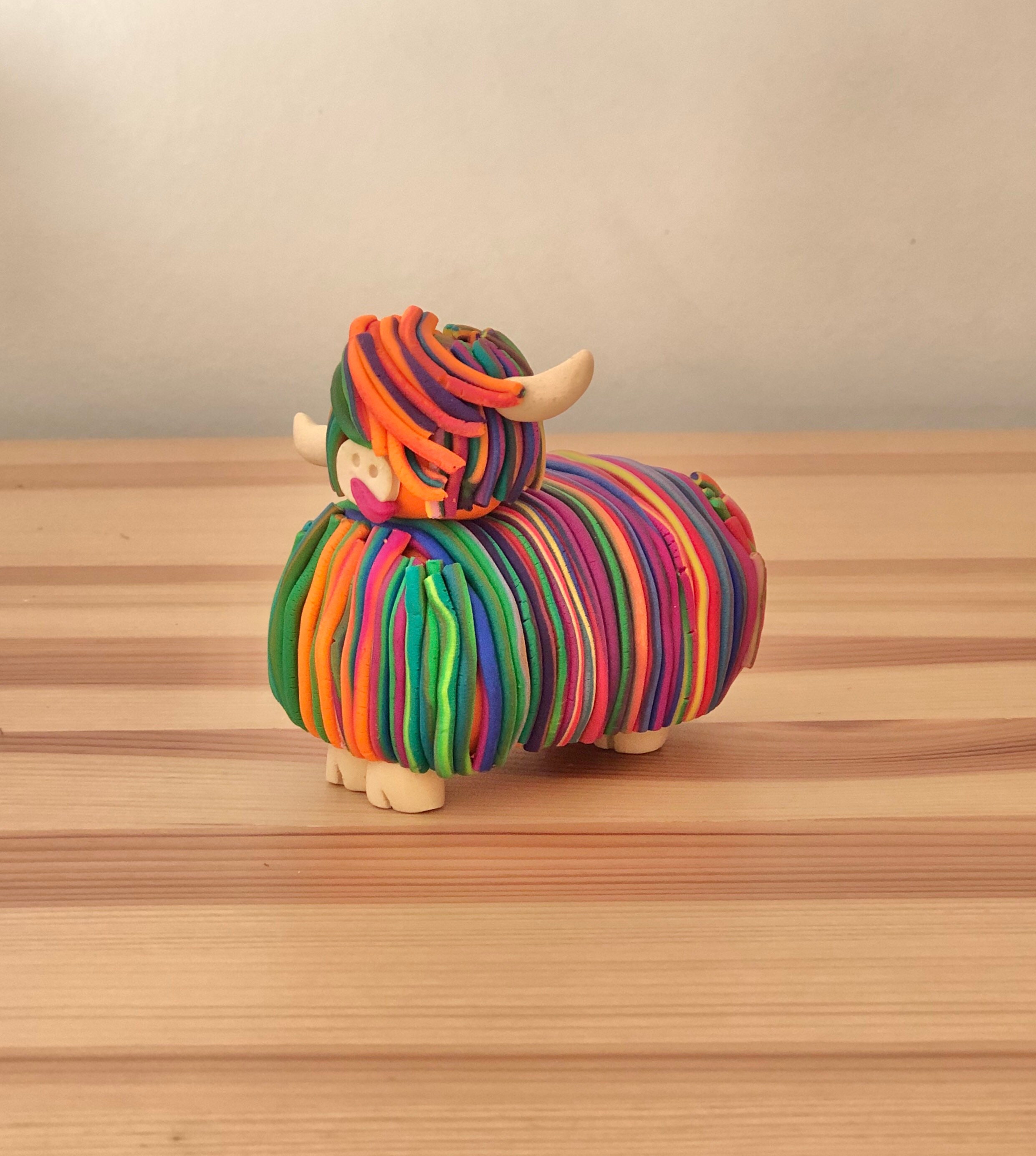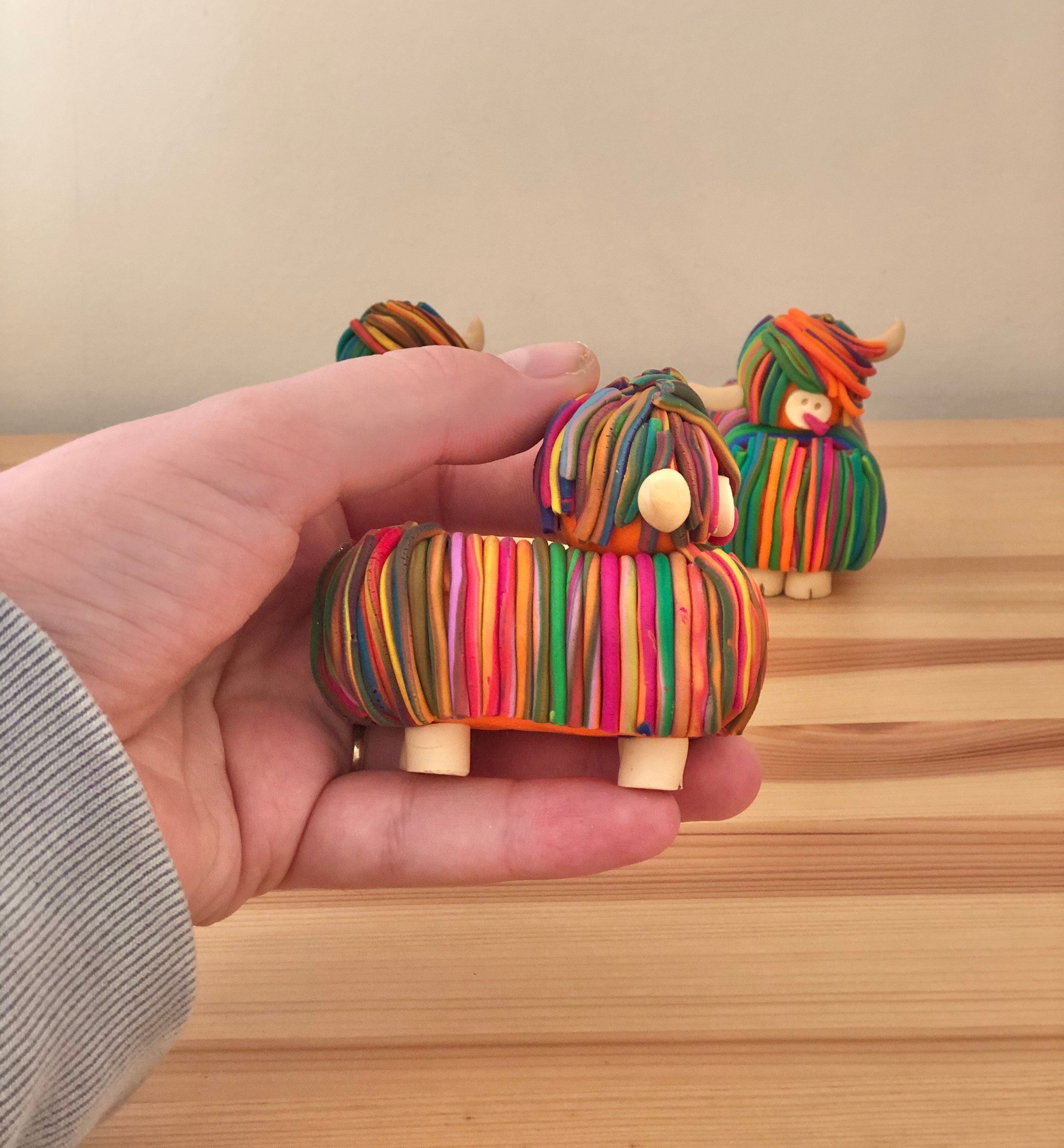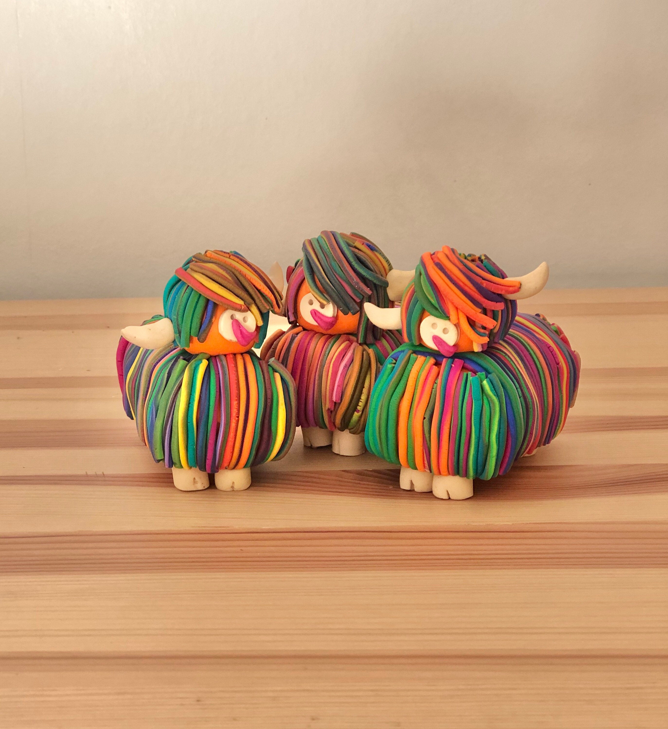 Highland cow models each one is individually designed and unique and inspired from the Scottish wildlife from my highland based art room. The Highland Cow models are designed and handmade by me so each one is unique. I also make the designs in small batches so that each item can make a special gift for someone. Polymer clay is the base material, I combine many different colours to create an original and funky highland cow!